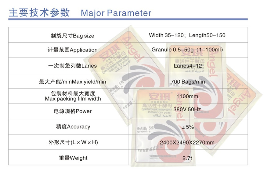 Correcting double-side symbols, automatic tracking adjustment. A series packing program completed automatically that is making bags, measure, filling, sealing, cutting, easy tear notches, line-crow easy tear line, typing code, accountings and so on. One filling and automatically packing multilane bags is completed in the same time.